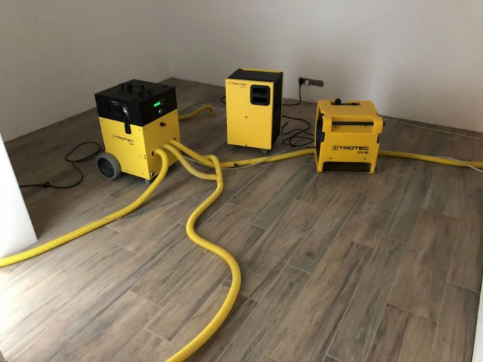 Wykorzystujemy osuszacze o odpowiedniej wydajności, pompy oraz separatory, które pozwalają odprowadzać wodę i wilgotne powietrze w sposób ciągły. Dzięki temu osuszanie przebiega równomiernie i nie powoduje „szoku” materiałów. To ważne szczególnie wtedy, gdy w grę wchodzą wylewki i okładziny – gwałtowne, niekontrolowane dosuszanie może prowadzić do pęknięć, odspojeń i kolejnych kosztów. My pracujemy tak, aby podłoga wróciła do formy bez zbędnego rozkuwania, a po zakończeniu osuszania można było bezpiecznie przejść do dalszych napraw lub wykończenia.